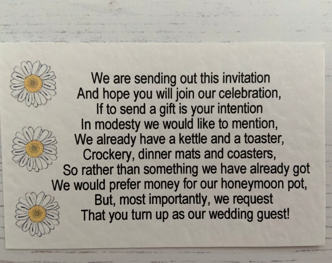Wedding Poem Cards - Triple Daisy Design - Requesting Cash Toward Honeymoon instead of gift list - To Accompany Invites